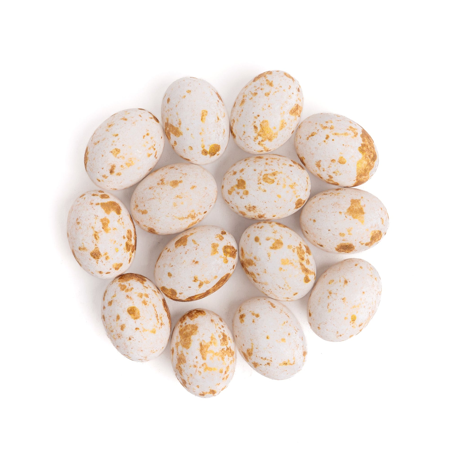Białe czekoladowe jajeczka ozdobione naszym kultowym GOLD DUST — uniwersalna dekoracja wielkanocna premium. Naturalna biel z subtelnymi złotymi akcentami pasuje do każdej kolorystyki i komponuje się zarówno z pastelami, jak i bardziej intensywnymi barwami. W środku aksamitne nadzienie czekoladowo-orzechowe, na zewnątrz chrupiąca cukrowa skorupka. Rozmiar ok. 28 mm.